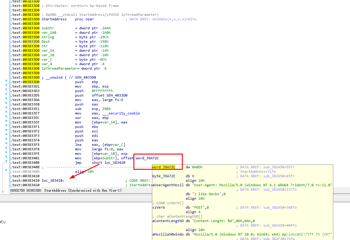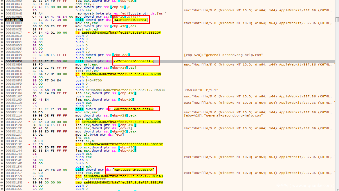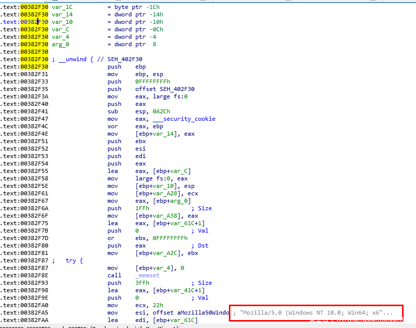 由于这样直接看不出什么,我们还是在IDA中跟进到sub_382F30:sub_382F30开头的部分是一堆赋值操作,在00382FA5的地方,可以看到一个硬编码的请求头部:Mozilla/5.0 (Windows NT 10.0; Win64; x64….