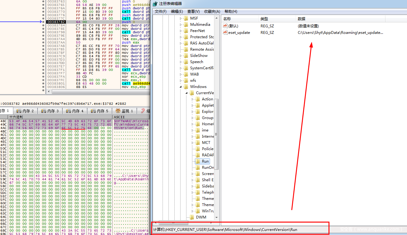 所以该函数的功能是将自身赋值到%appdata%目录下并重命名为eset_update.exe,然后将该路径写入到开机自启动中,键名称为eset_update。最后创建一个对话框以迷惑用户。