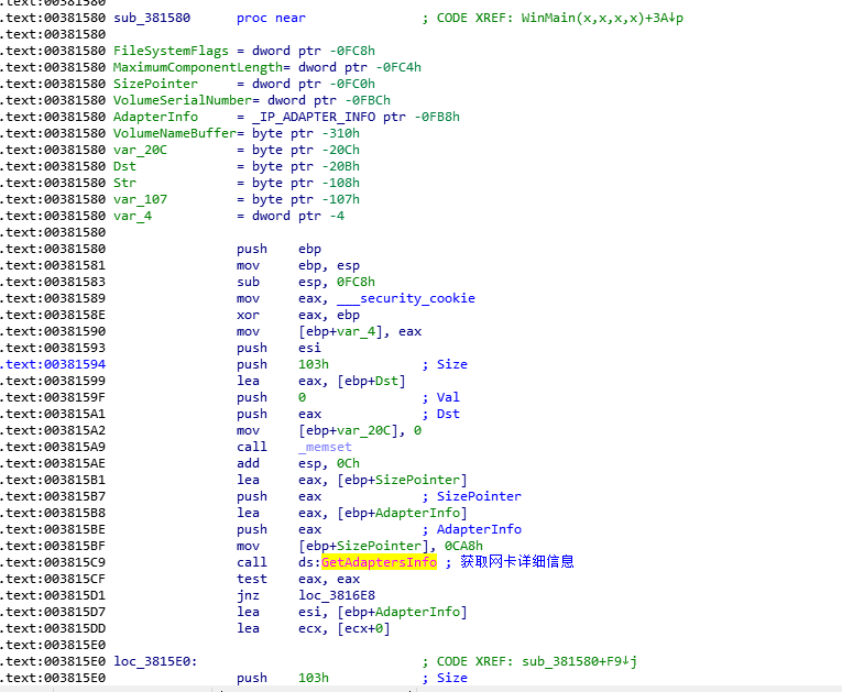 在sub_381580函数最开始,程序会通过GetAdaptersInfo来获取当前计算机的网卡信息。