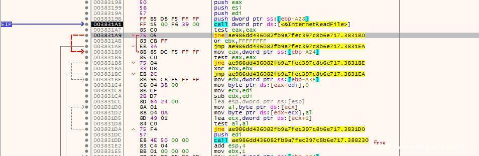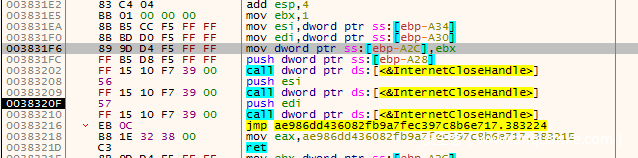 这里发现是_malloc用于开辟内存,所以我们就不用F7跟进到这个函数了,直接F8运行过,这里可以看到,如果InternetReadFile读取成功,则会跳转下去循环解密,如果读取失败则通过jmp跳转到最后关闭请求句柄,结束函数