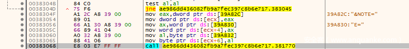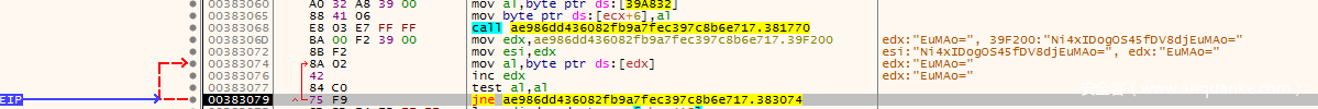 这里红色表示会跳转上去,我们直接点到下一行的位置(00382FF4),然后F4跑完该循环,接着继续单步往下走,遇到循环就通过F4的方式跑完这个循环,直到在00383068这一行看到call 381770