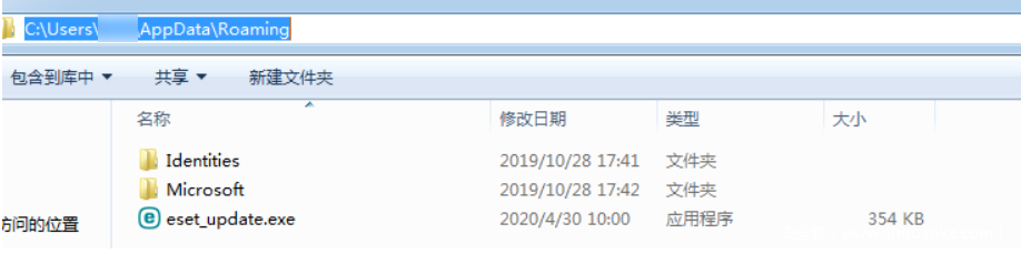 结合上面的file_touch、file_open、file_write、file_chmod等操作,我们可以知道程序会在C:UsersxxxAppDataRoaming这个路径下释放一个名为eset_update.exe的PE文件。