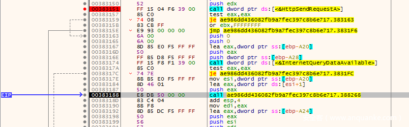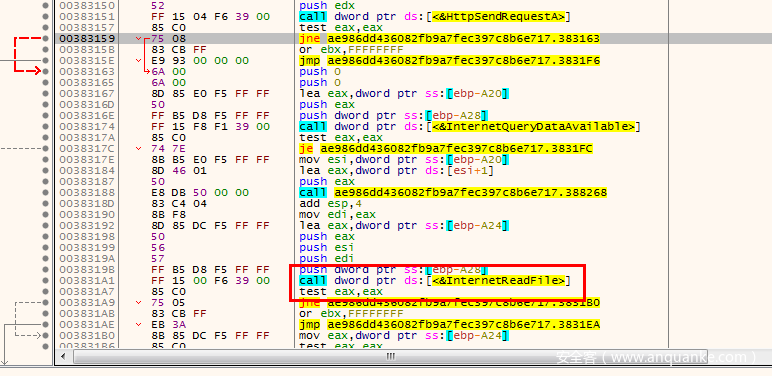 如果数据成功通过HttpSendRequest发送成功,程序则还会调用InertnetReadFile读取数据
