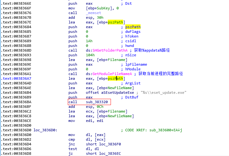 我们可以对eset_update.exe进行交叉引用,最后确定在WinMain的sub_403600中进行了引用。