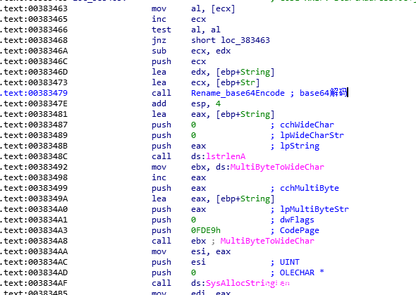 从图中可以看到,sub_381890之后会通过lstrlenA以及MultiByteToWideChar实现Unicode与UTF8相互转化。
