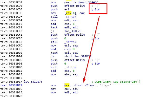 回到IDA中接着往后看,样本会将传进来的参数通过 | 分割,然后比较分割后的字符串是否有tiger标志。