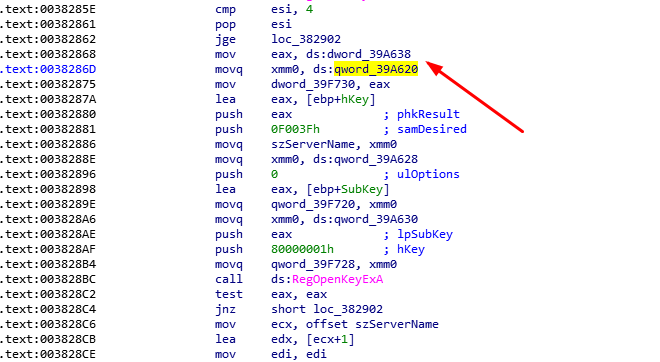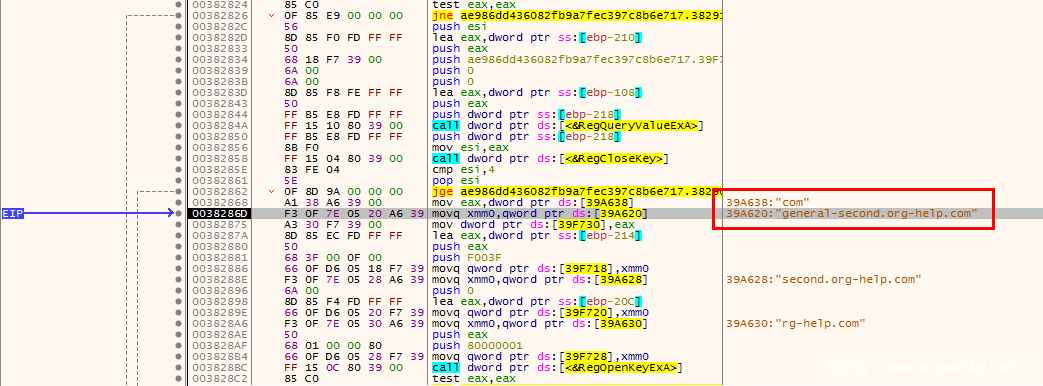 成功赋值之后,会将域名赋值给xmm0,然后赋值给szServerName。