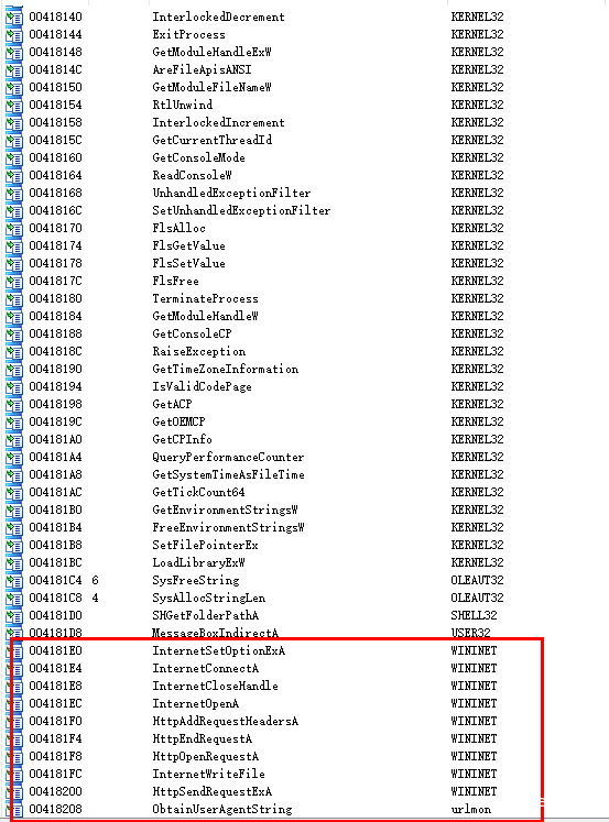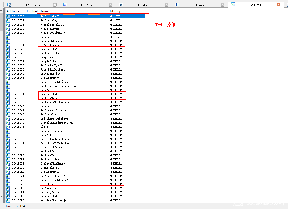 导入表中一共有124个API函数,我这里圈出了一些可疑的API。