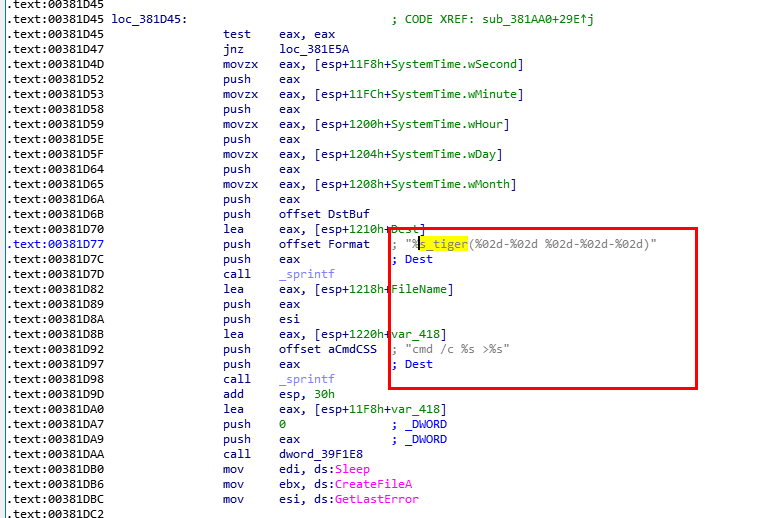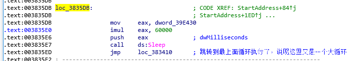 在loc_3835DB处休眠1分钟,然后又通过jmp跳转到上面loc_383410执行。说明此处是一个大循环。