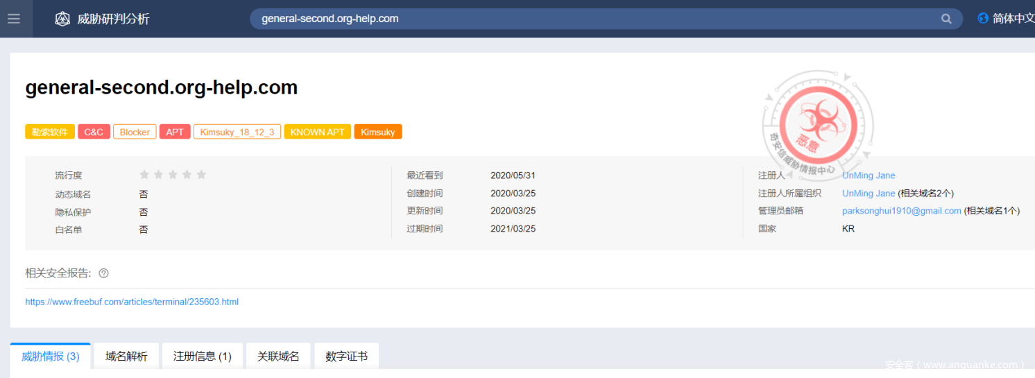 根据标签显示,该域名很有可能被APT组织KimSuky所使用,所以该样本,很有可能来源以APT组织KimSuky。