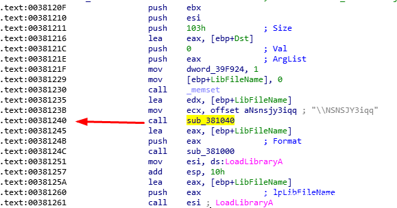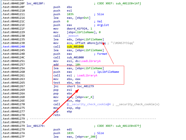 而[ebp+LibFileNmae]在上面赋值给了edx,和ecx一起传到了sub_401040这个函数中。