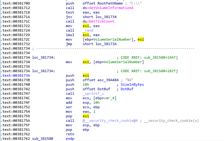 随机数生成成功,存放到esi中,传到后面的_sprintf_s与DstBuf(上面获取网卡存储的地址)进行格式化。