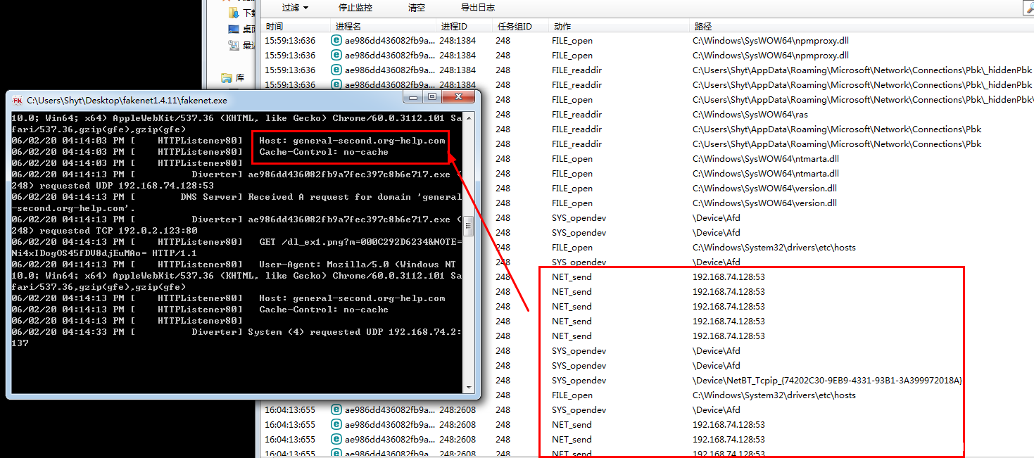 根据火绒剑和Fakenet的监控显示,本地主机(192.168.74.128:53)正在不断的向目标主机general-second.org-help.com发起请求。