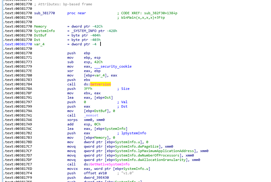 00381770函数一进来就可以看到程序在通过GetVersion和GetNativeSystemInfo获取计算机的操作系统版本和位数。