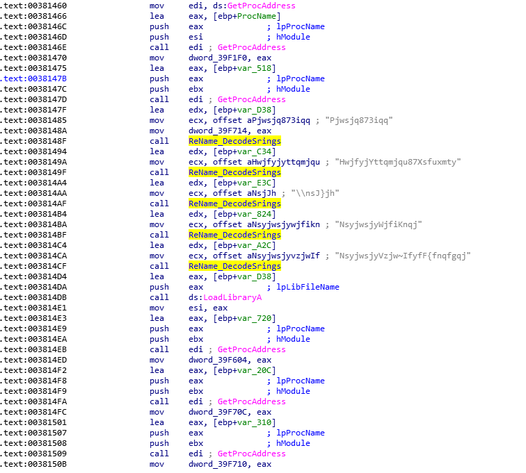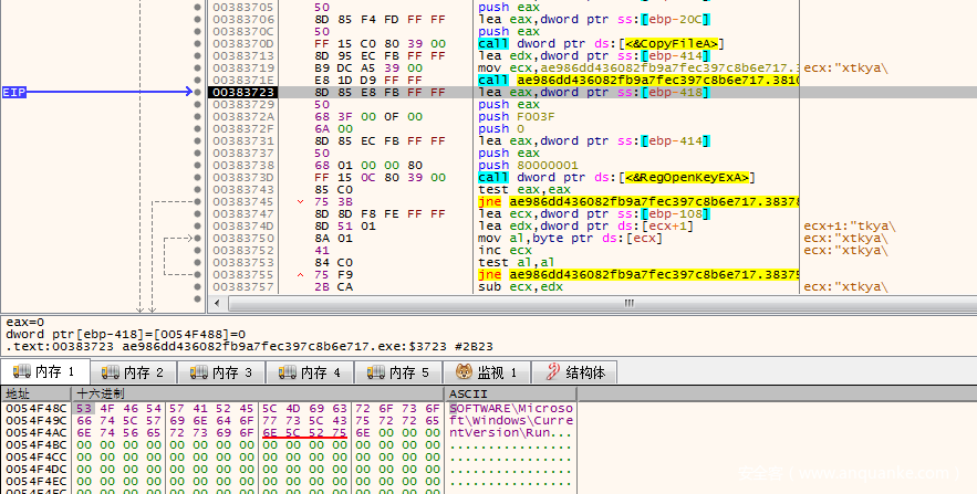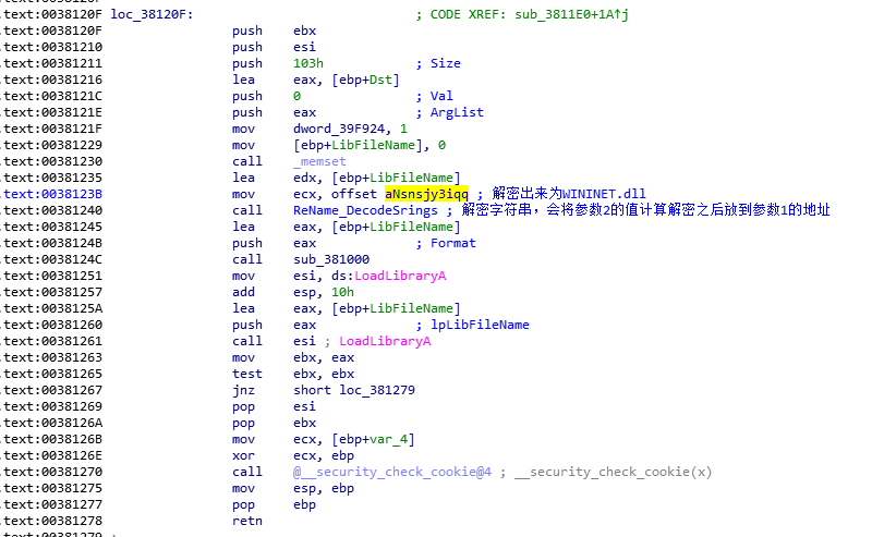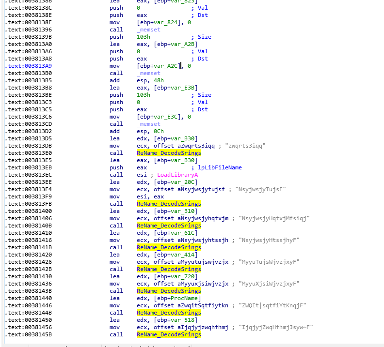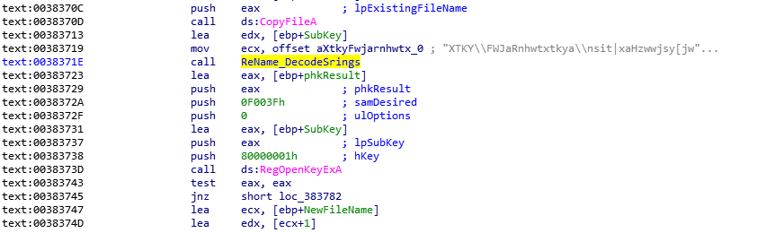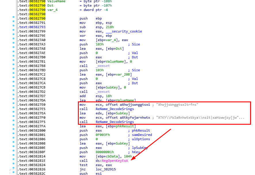 sub_382790进来之后,可以看到程序调用ReName_DecodeSrings解密了两个字符串,然后调用了RegOpenKeyEx