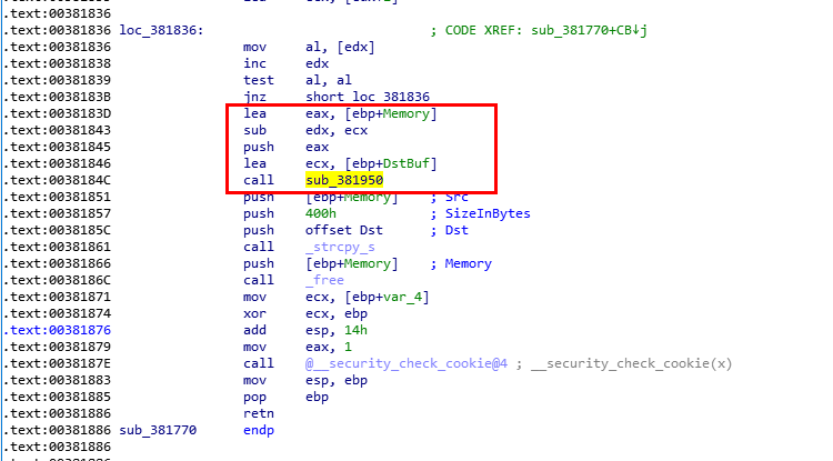 跳转过来之后,程序通过_memset给[ebp+Str]赋值,然后作为参数传递到了sub_382F30中