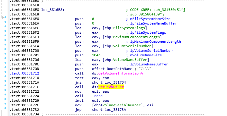在loc_3816E8处则会调用GetVolumeInformationA获取磁盘序列号。这里是获取C盘。