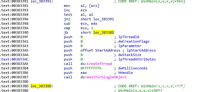 首先一个一个小循环来判断ecx是否有值,然后通过CreateThread创建了一个新线程。新线程地址在StartAddress。