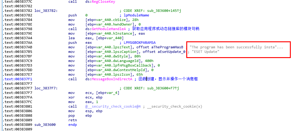 成功设置好开机自启动之后,程序会调用GetModuleHandleA和MessageBoxIndirectA以创建一个消息提示框,提示框的标题和显示内容如红框所示,跟我们在行为分析中看到的一样。