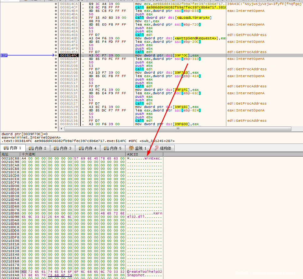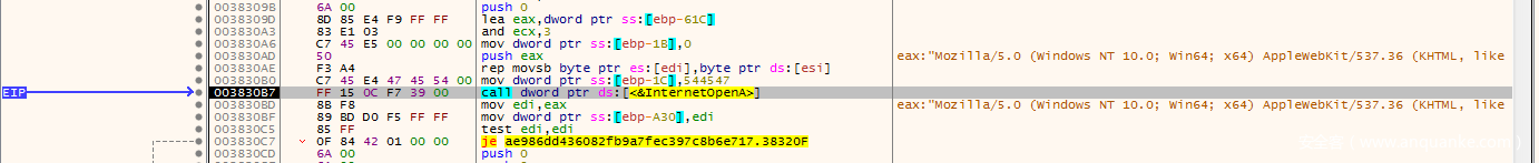 在003830B7的地方看到了call InternetOpen