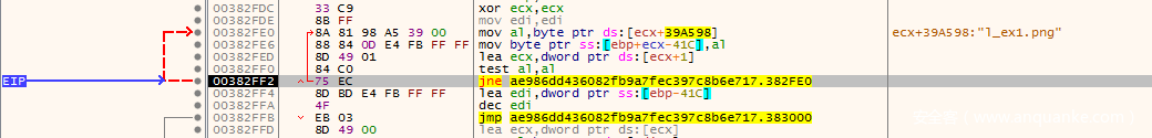 将鼠标点到00382FE0(dl_ex1.png赋值的地方)这一行,然后F4跑过来,F8往下单步执行:
