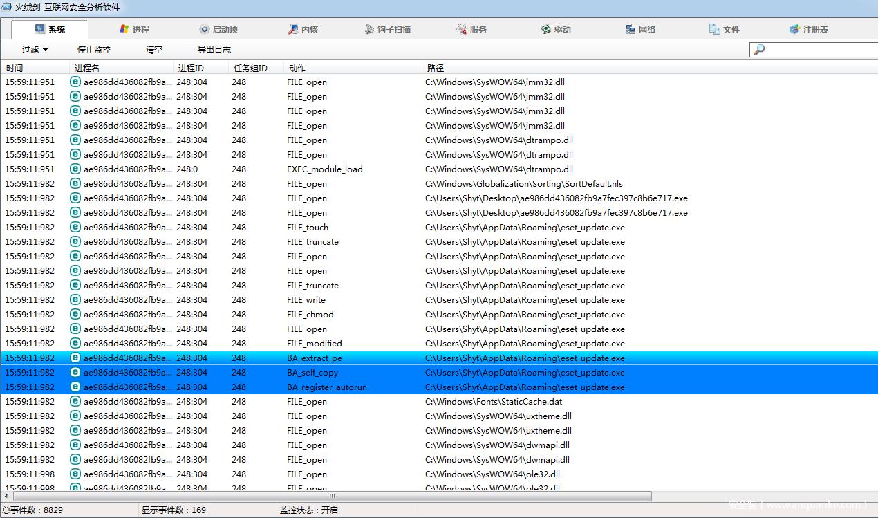 蓝色部分很醒目,火绒剑自动标识出了三个可疑行为。