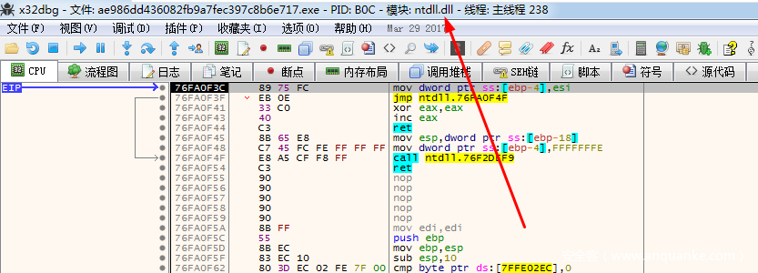 程序加载之后,会默认停留在ntdll.dll模块中,也就是系统代码中,这里我们直接F9跑到程序的默认入口点