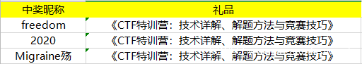 获奖方式3:参与微信公众号文末评论活动,抽3名用户赠送《CTF特训营:技术详解、解题方法与竞赛技巧》 !