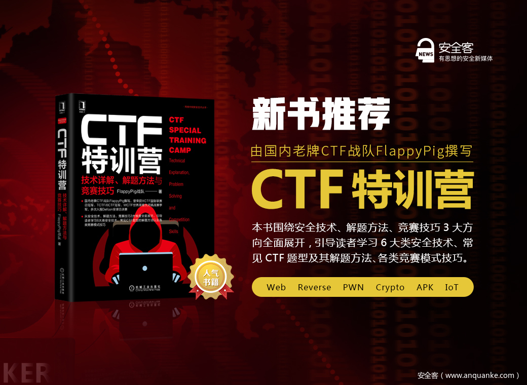 就像这本书的作者FlappyPig战队说的“CTF是一门偏重于实践的学问,仅靠读一本书、一篇论文,或者学一门课是远远不够的,它需要足够的兴趣和精力,不停地做题、实战、锻炼,并没有捷径可走。 ”于是,小安成功的帮你们争取到了8本免费赠书名额!(见文末福利)网络安全大赛这个东西,要不你就别碰,碰了,就给我拿出点成绩来!