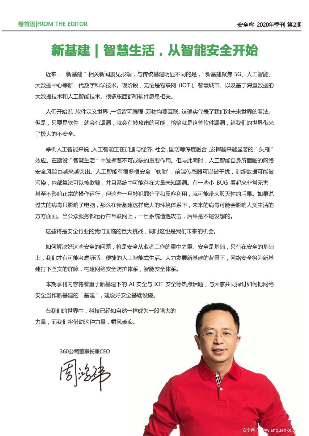 近来,“新基建”相关新闻屡见报端,与传统基建明显不同的是, “新基建聚焦5G、人工智能、大数据中心等新一代数字科学技术。人们开始说,软件定义世界,一切皆可编程,万物均要互联。如果说过去的病毒只影响了电脑,那么在新基建这样庞大的环境体系下,未来的病毒可能会影响人类生活的方方面面。在大力发展新基建的背景下,网络安全将为新基建打下坚实的屏障,构建网络安全防护体系,智能安全体系。本次季刊即是以“新基建 | 智慧生活,从智能安全开始 ”为主题,与大家一起共同探讨。
