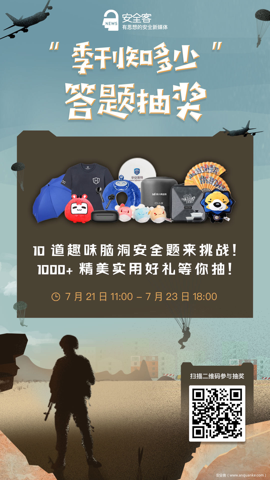 7月21日,安全客2020季刊—第2季再度上线,我们对文章的质量严格把关,对品质始终恪守不渝,只愿为安全爱好者带来最好的干货!从7月21日的11点到7月23日的18点,我们还放送出了数量丰富实用精致的定制好礼,赶紧参与季刊活动赢取奖品吧~