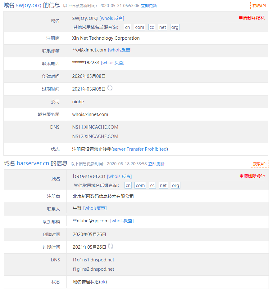 在协助抓捕作案人员的过程中,360安全大脑根据网吧服务器木马使用的C&C地址 “www.swjoy.org” 和“www.barserver.cn”查询whois域名注册信息,发现注册人出自同一可疑人员,注册时间与该案件发生时间段也比较吻合。