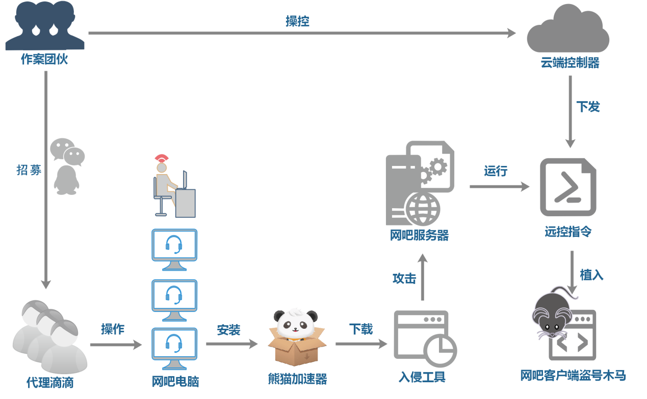 在对该木马攻击进行追踪溯源后,根据已成功掌握的入侵原理、最终目的以及控制服务器地址等重要信息,360安全大脑分析出了该作案团伙的整体运行流程。其中,作案团伙利用多样的攻击方法,对“易乐游”、“网维大师”和“云更新”3种主流网吧管理平台实施入侵,从而完成了大规模的网吧植马。