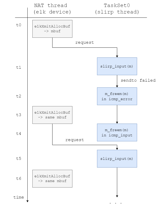 在T2时刻的第一次free期间,mbuf m将被放置在空闲列表的顶部,在下一次分配(T3)期间,将从空闲列表的顶部选择相同的mbuf并将其再次放置在已用列表中。然后第二次free将发生在slirp线程(T4)中,这会将m再次放入空闲列表,并允许我们在T6时再次分配相同的mbuf。