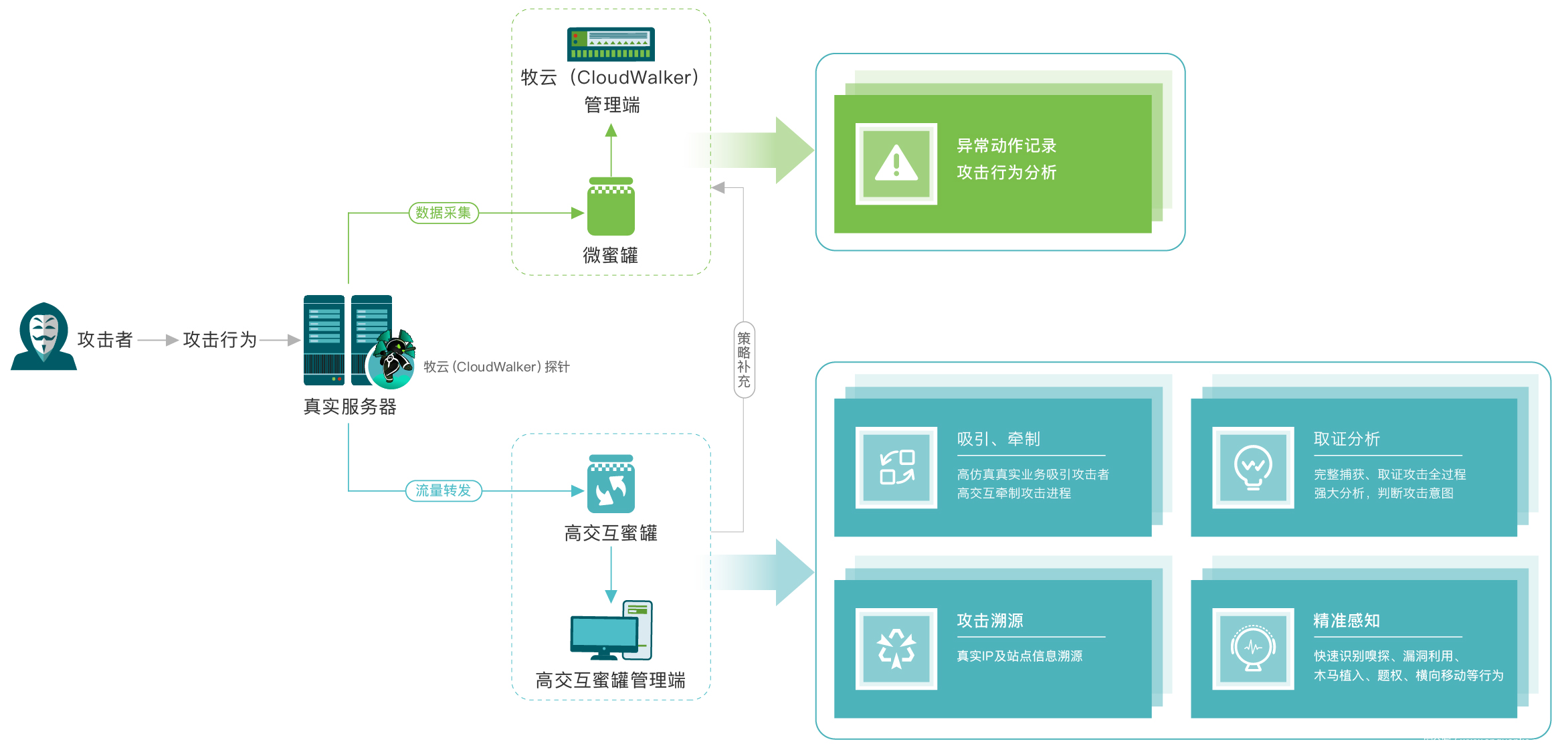 牧云(CloudWalker)主机安全管理平台可为客户提供多维资产的持续性安全检测分析与响应,具备资产状态监测、脆弱性与基线安全评估、入侵行为实时感知、风险闭环管理等能力,通过微蜜罐和与高交互蜜罐的联动使自身获得欺骗伪装技术的加持,提供基于主机的主动诱捕能力。牧云(CloudWalker)Agent探针与高交互蜜罐的联动,不仅扩充了蜜罐系统的检测节点,增强蜜网环境的欺骗伪装能力,同时将蜜网系统捕获到的攻击行为形成内网攻击情报,通过攻击情报来进一步优化牧云(CloudWalker)主机安全管理平台的防护策略,提升真实服务器的主动防护能力。