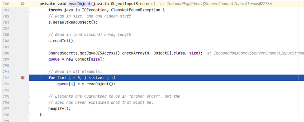 从头开始跟进分析整个利用链,先来看看PriorityQueue.readObject()方法。