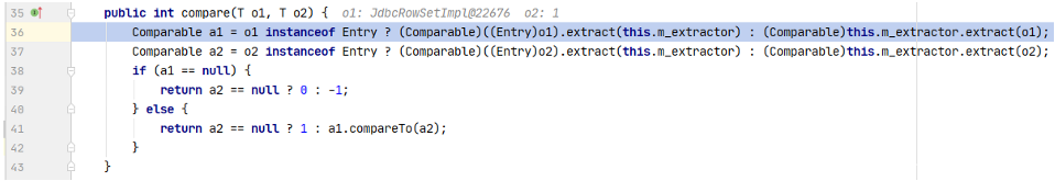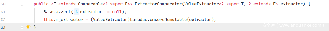 是在PriorityQueue的构造函数中被赋值的,并且这里可以看到,queue对象数组也是在这里被初始化的。那么结合上述所分析的点,我们需要构造一个长度为2的queue对象数组,才能触发排序,进入siftDown()方法。同时还要选择一个comparator,这里选用ExtractorComparator。继续跟进ExtractorComparator.compare()方法。