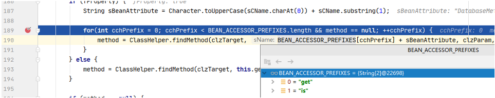 回到extractComplex方法中,在if条件里会对上述返回的方法名做首字母大写处理,然后拼接BEAN_ACCESSOR_PREFIXES数组中的前缀,判断clzTarget类中是否含有拼接后的方法。这时发现无论如何我们都只能调用任意类中get和is开头的方法,并且还要是无参的。