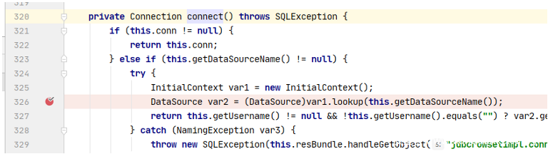 其connect方法中调用了lookup方法,并且DataSourceName是可控的,因此存在JNDI注入漏洞,看看有哪些地方调用了connect方法。