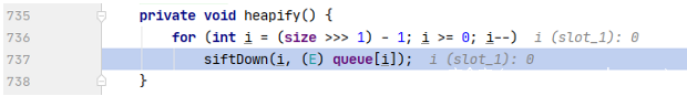 这里会取一半的queue数组分别执行siftDown(i, (E) queue[i]);,实质上PriorityQueue是一个最小堆,这里通过siftDown()方法进行排序实现堆化,那么跟进siftDown()方法。