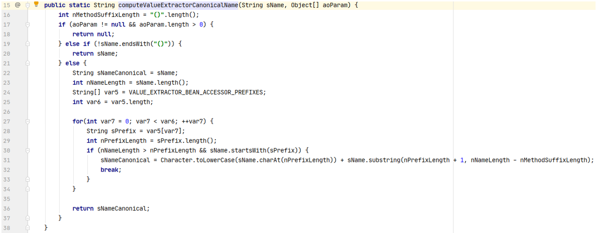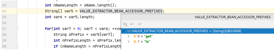 此处不难理解,如果aoParam不为null且数组长度大于0就会返回null,因此我们调用的方法必须是无参的(因为aoParam必须为null)。接着如果方法名sName不以 () 结尾,则会直接返回方法名。否则会判断方法名是否以 VALUE_EXTRACTOR_BEAN_ACCESSOR_PREFIXES数组中的前缀开头,是的话就会截取掉并返回。