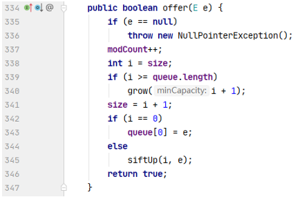 不难理解,每add一次,size加1,根据上述heapify方法,只会从开头开始取一半的queue数组执行siftDown方法。所以size至少为2,需要执行两次add方法,而不是add(2)一次。
