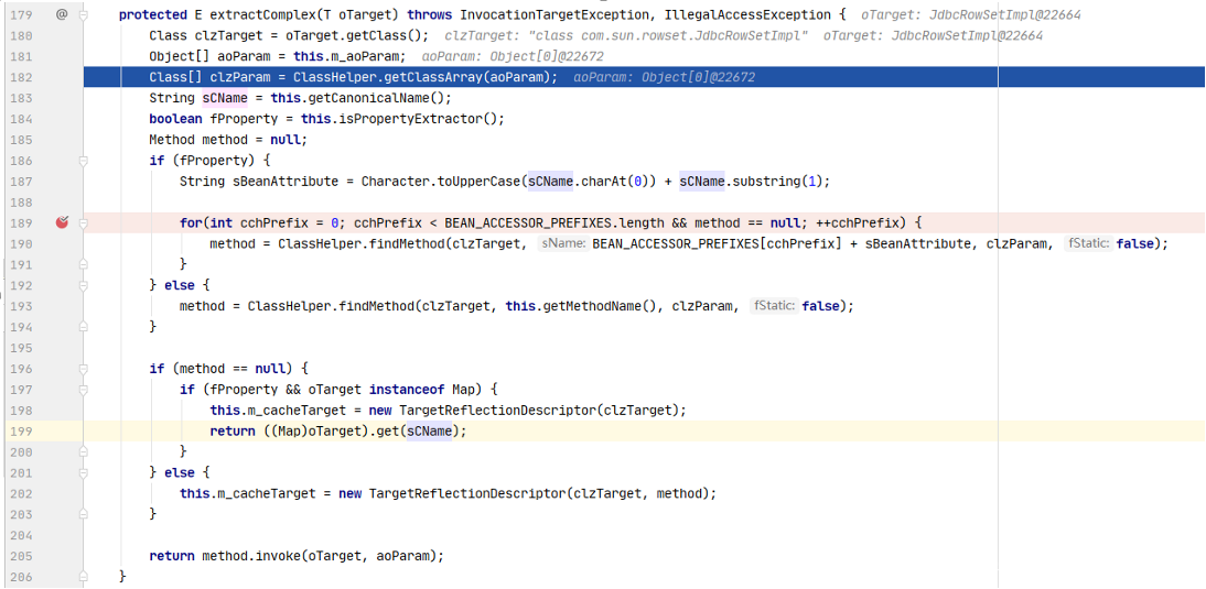 显而易见,传入一个空的Object[]即可。回到extractComplex()方法,此时我们只要我们进入第192行的else语句中,即可调用任意类的任意方法。但此时还需要fProperty的值为false,跟进isPropertyExtractor()方法。