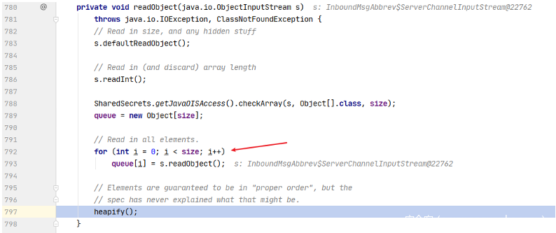 第792会执行for循环,将s.readObject()方法赋给queue对象数组,跟进heapify()方法。