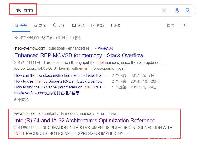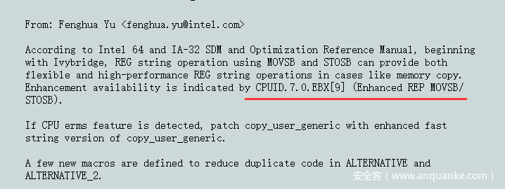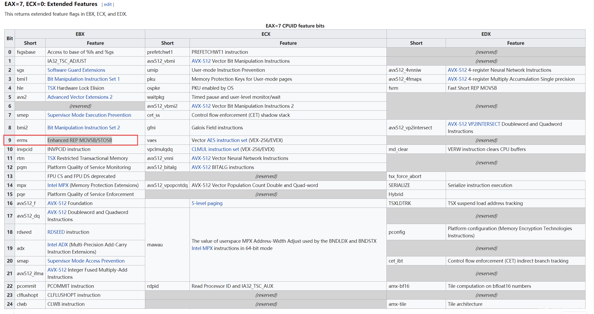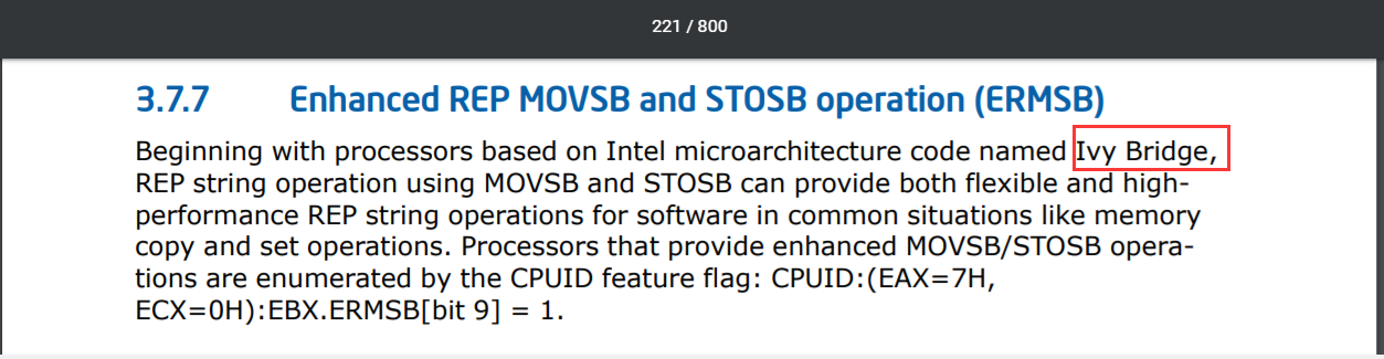 根据搜索到的信息来看,这个所谓的ERMS确实是Intel提供的优化新能的指令,CPUID+7就是来检测当前的CPU是否支持这个性能优化指令的;一切都顺理成章;那下边就要确定下从哪一代Intel的CPU开始,这个ERMS特性是支持的了,这个要查询Intel的白皮书了;