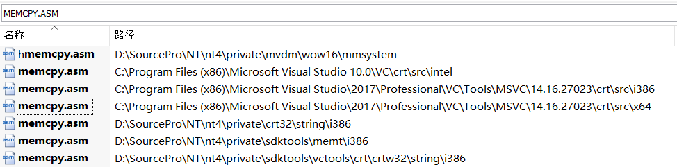 很清晰,代码里在拷贝数据,从VCRUNTIME140!memmove这一帧可知,代码执行时,是想从0x073d4930拷贝数据到0x04b84934,拷贝的长度是0x00000d90;根据对汇编中,这种拷贝指令的了解,一般情况下,编译器在生成汇编指令时,都是用的ecx/rcx作为的重复计算的次数,CPU内部每次执行完带有循环结构的指令,如loop或者rep之类的前缀时,都会检测rcx/ecx是否为0;那我们暂且先按照这个假设来看下出问题的寄存器上下文;ecx居然是0xffeff6c4;这不正常,这大概率是异常了,即ecx不停的减1,减到0时没有停止而是继续减下去了;这不合理啊。好了,不猜测了,我们看下memmove的汇编代码;根据Windbg提供的信息可知,memmove这个函数的实现在 MEMCPY.ASM这个文件中,用EveryThing搜索的了下,结果如下: