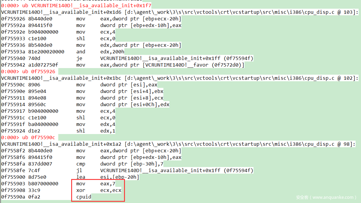三次ub指令便找到了根源;原来是用的cpuid指令,传入的参数是7;当然根据善解人意的Windbg的提示可知,这个函数在cpu_disp.c这个文件中实现了,那就找下这个文件;