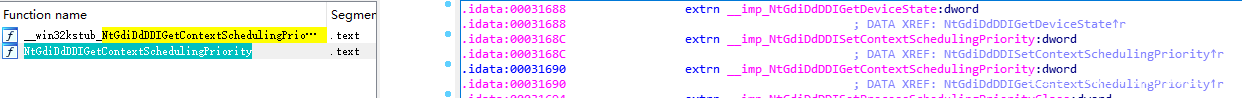 然而我们顺着找这个win32k!_imp__NtGdiDdDDIGetContextSchedulingPriority的地址,可以找到如下内容: